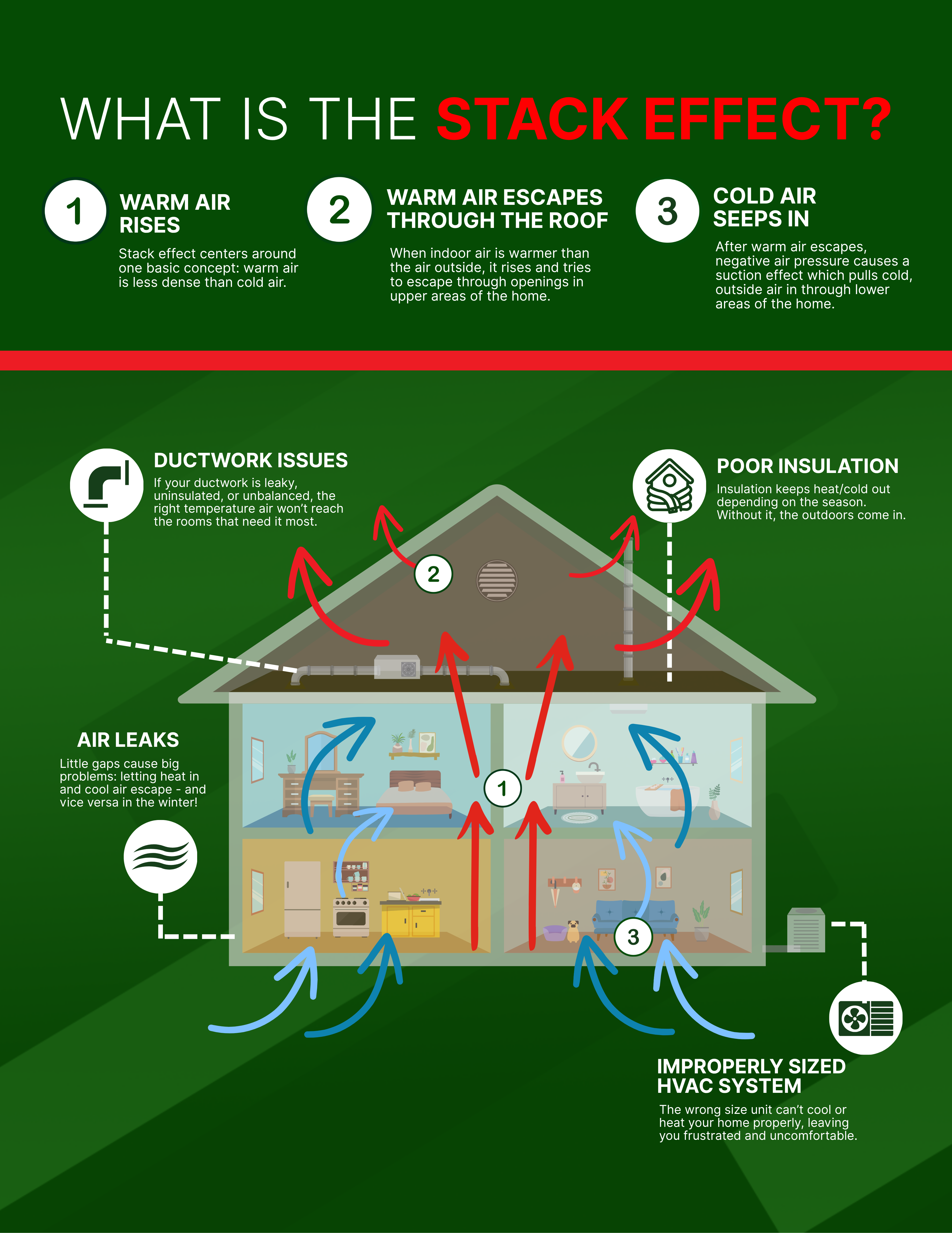 The stack effect is the invisible force making your home uncomfortable and driving up your energy bills. This natural phenomenon occurs when warm air rises and escapes through the upper levels of your home, while cold air gets pulled in through gaps and cracks in the lower levels.